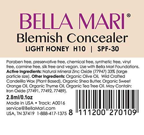 This pure all natural and organic concealer stick has a creamy consistency that makes it easy to apply. It is an excellent cover up concealer for acne, dark spots, freckles. In addition to using this is as a cover up concealer for acne you can use for touch ups when used together with the matching Bella Mari Moisturizing Foundation in Light Honey and the matching Concealer Cream for dark circles under the eyes. The organic herbs in this organic concealer stick help support the healing process of pimples. This organic concealer stick contains zinc oxide that is derived from natural earth minerals without using nano particles. Bella Mari proudly makes this cover up concealer stick in the USA with organic and wild crafted ingredients. *** CONCEALER STICK COLORS; Light Rose | Medium Rose | Light Tan | Medium Tan | Dark Tan | Light Honey | Medium Honey | Dark Honey | Light Beige | Medium Beige | Dark Beige | Light Ivory | Medium Ivory. Search for all colors on Amazon.com and enter Bella Mari Concealer Stick and then the desired shade. Also see the matching Bella Mari Talc Free Moisturizing Foundation.Feature