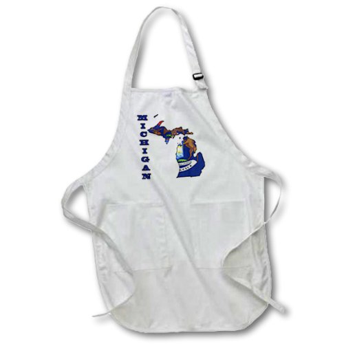 3dRose apr_58743_1 Michigan State Flag in The Outline Map and Letters for Michigan Full Length Apron with Pouch Pockets, 22 by 30-Inch, White, with Pockets