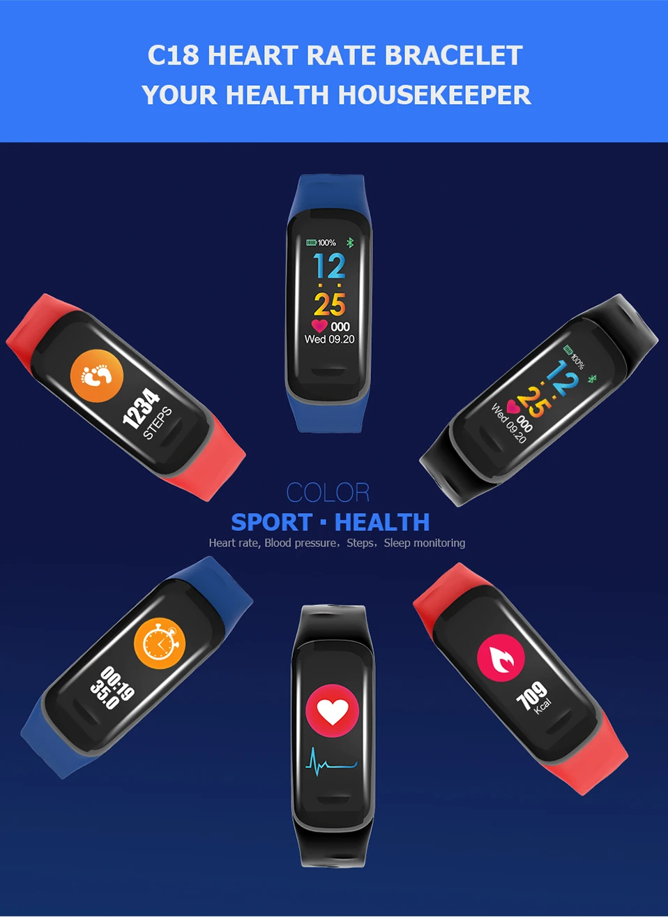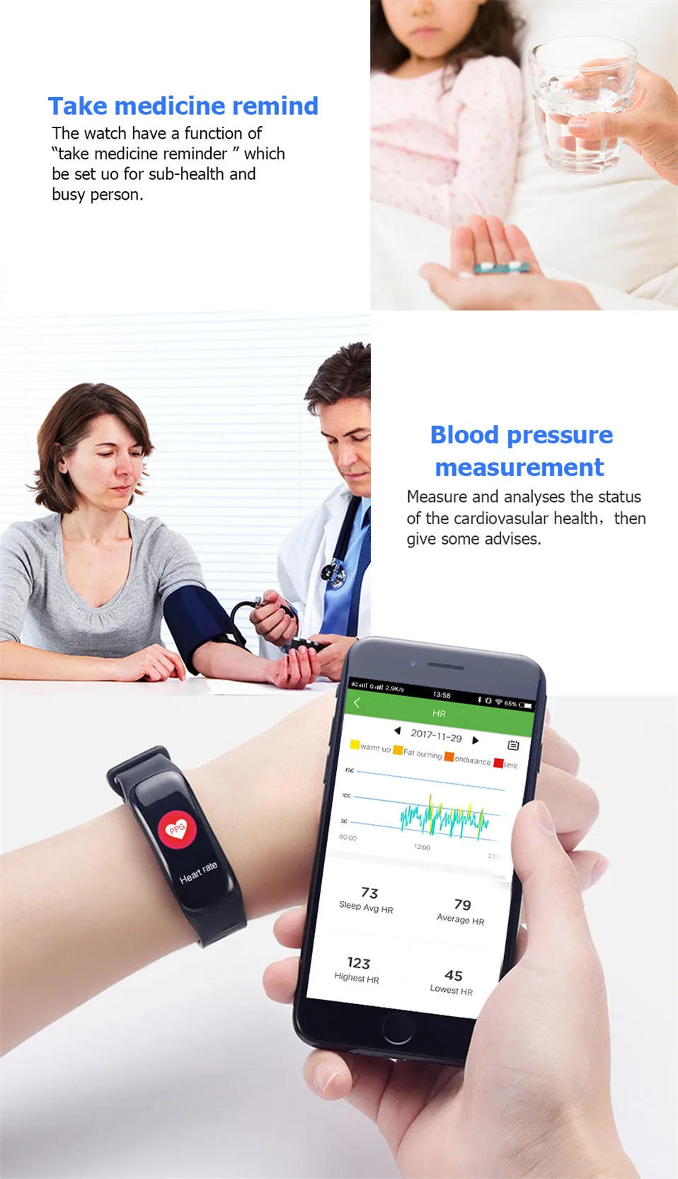 Feature A:Smart Color Bracelet 24 Hours Real Time Heart Rate Monitor