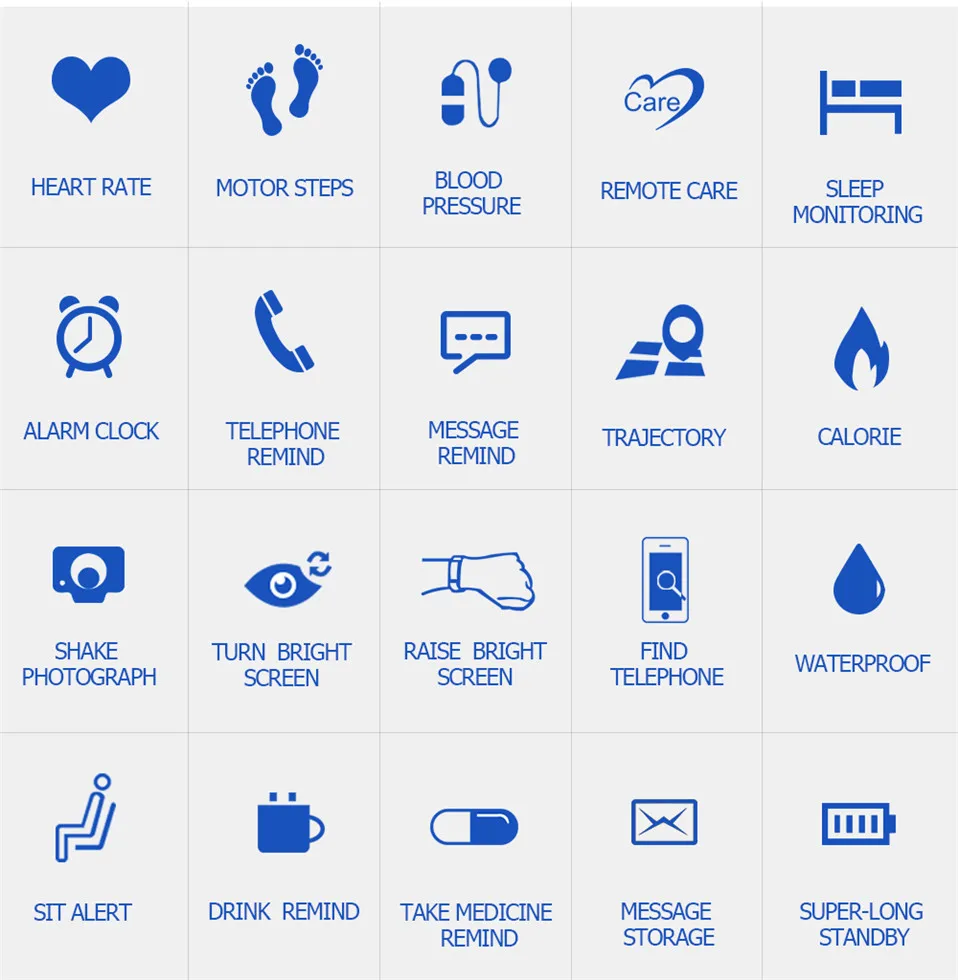 Function:Passometer,Sleep Tracker,Calendar,Push Message,Heart Rate Tracker,Alarm Clock,Remote Control,Fitness Tracker,Message Reminder,Call Reminder