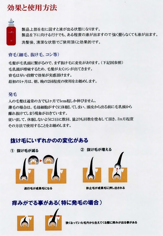 | ご使用方法 | 朝・晩の2回、ボトルから直接頭皮全体に塗布し、 揉み込むようにマッサージしてください。 キャップ上部を右に半回転させると少し浮き上がり、ロックが外れ、 中の液体が出る状態になります。 お風呂上りなどは、ドライヤーでよく乾かした後、ご使用下さい。 本製品は頭皮だけでなく、毛髪にも働きかけ、艶やかな仕上がりに なりますので、髪全体にも馴染ませてください。 乾かす必要はありません。 使用後は、キャップを左に半回転させ閉めて下さい。 |