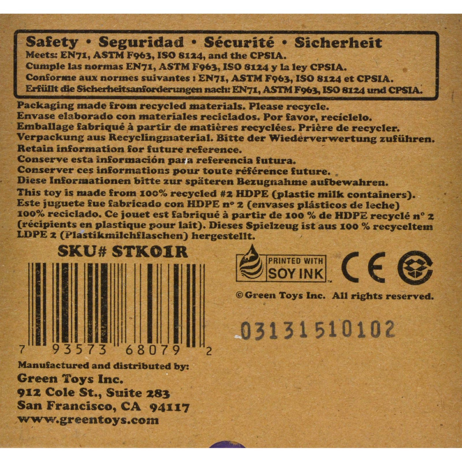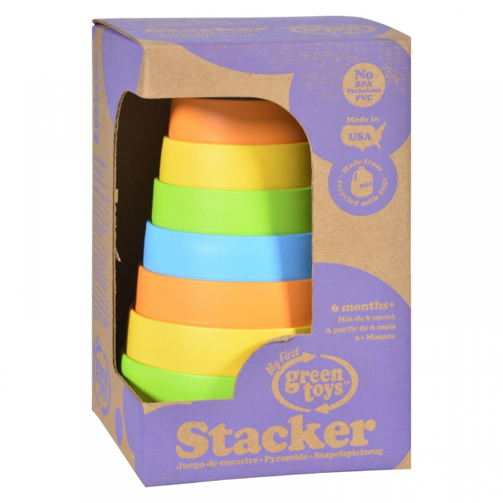 | The Green Toys Stacker takes a classic toy and makes it safer and more playful. The eight whimsically colored nesting pieces stack easily from large to small, while also allowing little builders to use their imagination and stack in any order. Little ones can develop hand-eye coordination and color recognition while having plenty of Good Green Fun. Most importantly, the Green Toys Stacker is safe. Its unique design has no center post. Here's an even greater incentive to make your kids drink their milk. Green Toys uses recycled milk containers as the main ingredient to create their toys. The milk containers are re-processed into high-density polyethylene (HDPE). It's one of the safest, cleanest plastics around. Everything from the collection of materials to the production of Green Toys occurs in Los Angeles, CA. Local production of toys means that far fewer miles are used for transportation. On average, every pound of recycled milk jugs used in the making of Green Toys saves energy equal to 3,000 AAA batteries. Green Toys products are tested by nationally recognized, independent, third-party labs (located in the USA.) They contain no traceable amounts of Phthalates or BPA. They are also designed without any external coatings, eliminating the fear of lead paint. Although Green Toys may not be as nutritious as a glass of milk, you no longer need to worry about what odd chemicals your kids are ingesting every time they launch a playful bite into one of their toys. No BPA, PVC, phthalates, or external coatings. This Stacker is made in the USA from 100% recycled plastic milk containers which save energy and reduce greenhouse gas emissions. Dimensions 7-3/8 H. Extra Safe with no center post, color combinations may vary. Ingredients : Recycled milk containers high-density polyethylene (HDPE) Country of origin : USA Size : CT Pack of : 1 Product Selling Unit : each |