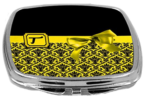 Rikki Knight Letter-T Monogram Damask Bow Design Compact Mirror, Yellow, 2 Ounce
