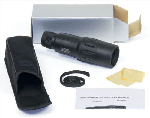 - Feature : Waterproof zoom monocular with a magnification range of 10x to 25x power / Big 42mm multi-coated objective lens provides bright and clear daytime views / Conveniently compact at less than 7 inches long and lightweight at just 12 ounces / Very short near focus distance of just 20 inches - like having a microscope in your hand! / Includes soft nylon case with belt loop and carrying wrist-strap