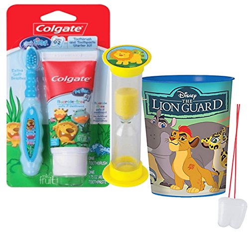 -. Feature : Turn something your kids have to do into something they want to do! And now available in a Toothbrush & Toothpaste Combo pack, because when brushing is fun, it gets done! / (1) Colgate My First Toothbrush and Toothpaste Starter Kit, 2 pc - The Colgate My First Children's Toothpaste and Toothbrush Starter Kit helps get your little one set for a lifetime of good oral health. Its extra-soft bristles are gentle on kids' gums. The kit includes a toothbrush and a tube of toothpaste. The paste is fluoride-free, so it's safe if your child swallows it. A mild fruit flavor makes the brushing experience more enjoyable. / (1) The Lion Guard 16oz Plastic Mouthwash Rinse Cup, Doubles As Toothbrush Holder! / (1) Dentist Recommended 2 Minute Jungle Animal Themed Brushing Timer! (Assorted Characters)