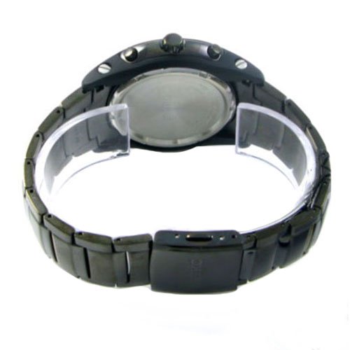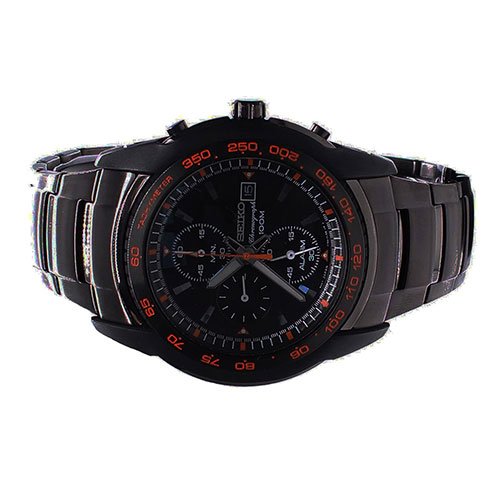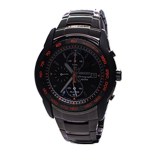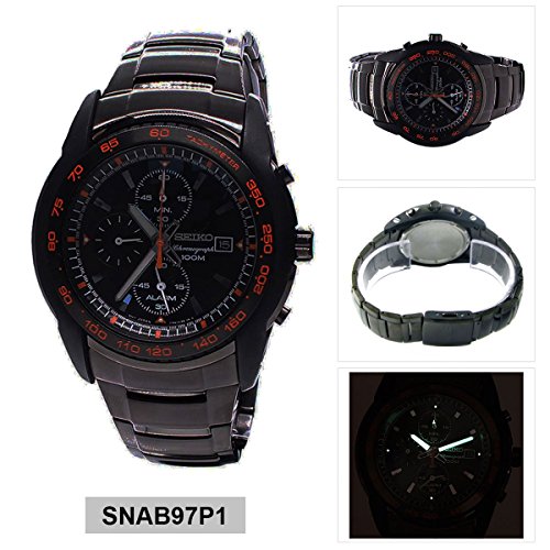 Introducing Seikos Sporty Chronograph Collection.Solid brushed, polished black anodized stainless steel case(45mm diameter by 12mm thick) and bracelet.3 sub dials for the alarm,second hand, and 60 minute hand.Black patterned dial with luminous silver toned hands and hour markers.Precisely tuned Japanese chronograph quartz movement.Date display feature.Tachymeter feature on bezel with orange accent.Alarm is 12-hour basis which can also indicate time on a different time zone.Finely crafted scratch resistant hardlex crystal.Chronograph measures 60 minutes in 1/5 seconds.Push-button deployment type clasp.Water resistant up to 100m.SNAB97