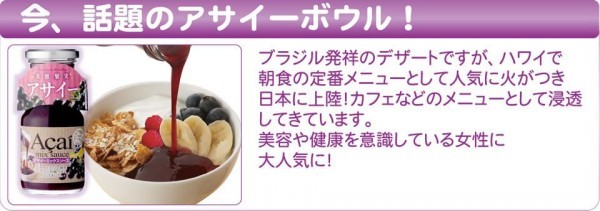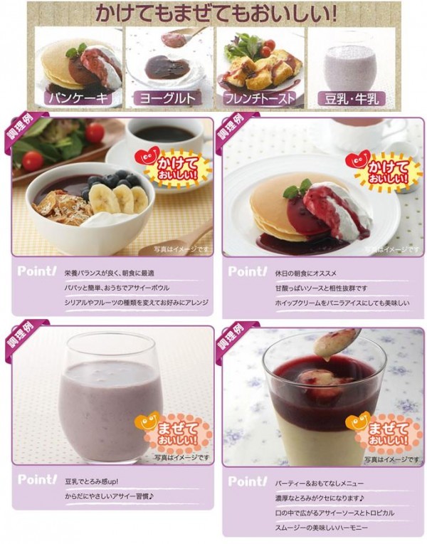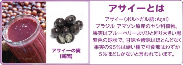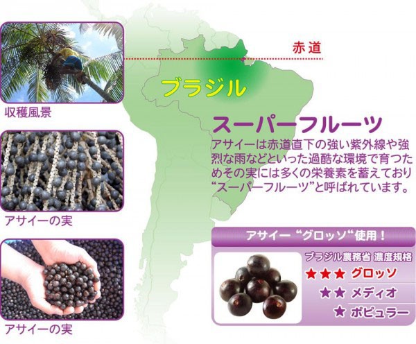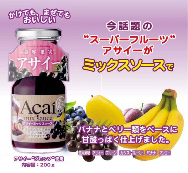 | 原材料 | 砂糖混合ぶどう糖果糖液糖、アサイーピューレ、プルーン果肉、濃縮カシス果汁、ブルーベリー果肉、バナナピューレ、はちみつ、マンゴーピューレ、増粘剤(加工澱粉、増粘多糖類)、酸味料、香料 |