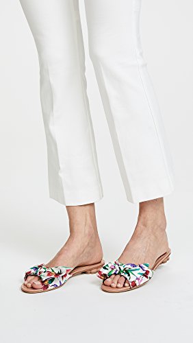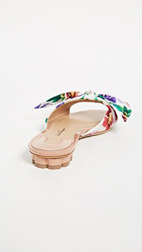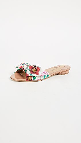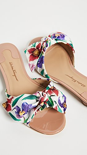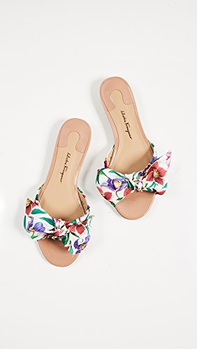 Product DescriptionWith the tiniest of heel lifts, these Salvatore Ferragamo slide sandals feature the brand's floral print of the season in silk bow form. Shiny, blush-tone patent leather accents the heel and toe.0