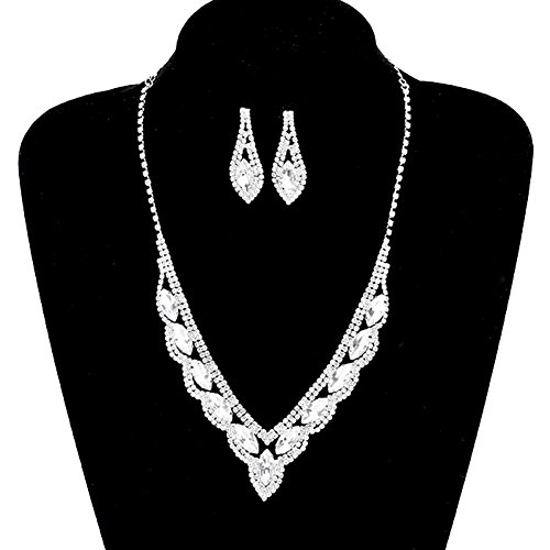 This is an elegant looking necklace with a simple and streamlined design, featuring 11 marquis cut clear rhinestones, each measuring 5/8 inch long and ¼ inch at the widest, surrounded by a double row edging of small, clear cut round rhinestones, set to form a gentle V shape.The necklace is 16 inches in length, with an additional 4 inches of wearable length available via extender chain.
