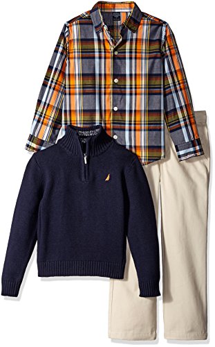 Nautica three piece set with a woven shirt, a quarter zip sweater, and flat front twill pants.