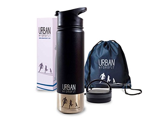 Urban Hydrofit 22 oz Stainless Steel Sports Water Bottle Insulated Travel Mug Keeps Drinks Cold 24 Hours or Hot 18 Hours plus 2 Lids and Sack