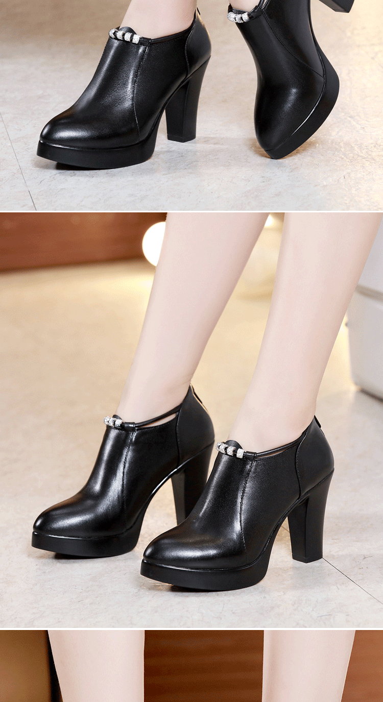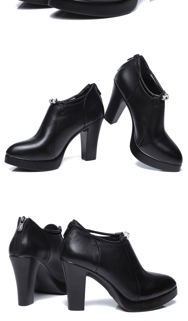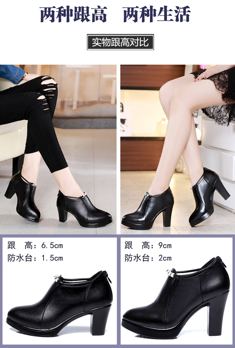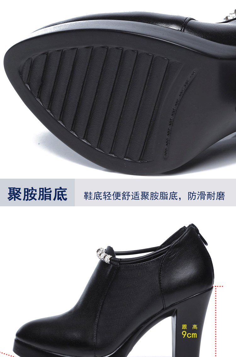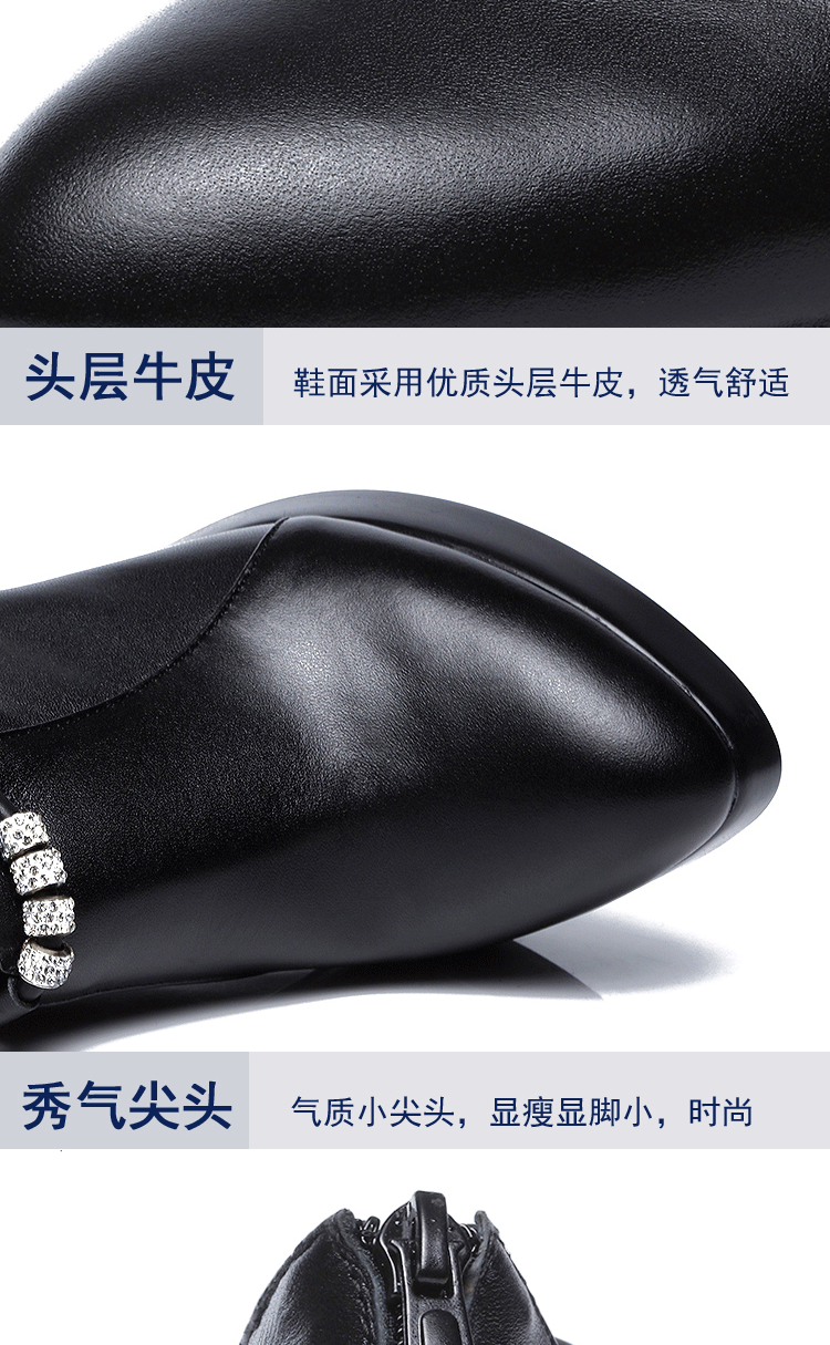 头层牛皮单鞋尖头韩版走秀工作女鞋高跟防水台拉链水钻真皮绒棉鞋