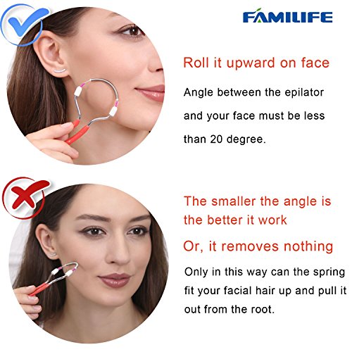 ★★HOW TO USE Roll it upward on your face, only in this way can the epilator do work. Place it in your face against the direction of the hair growth. The angle between the epilator and your face must less than 20 degree. The smaller the angle, the greater the effect. ★★ABOUT THE PAINFUL Our facial hair remover may hurt at the first time, as you are ripping hairs out from the root, but it doesn't hurt near as bad as waxing or epilating. the less painful it becomes, and less hair grows back. So if it hurts badly for you, stick it out! The next time won't be near as bad.