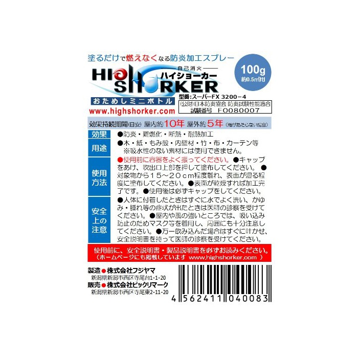 원본상품명: 防炎スプレ?「ハイショ?カ?」(防炎加工?)100gスプレ?(約0.5㎡用)