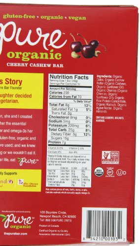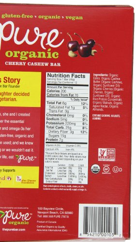 Loaded with natural ingredients like fruits, nuts, and whole grains, and luscious elements like chocolate, vanilla and nut butters, Pure Bar products are pure joy. These Pure Organic bars are made with tart cherries, creamy cashews, delicious almonds, and rich walnuts. Bring along these individually-wrapped bars to work, school, or even on camping trips as a refreshing snack. These bars are Certified Organic, Non GMO Project Certified, vegan, gluten-free, soy-free, and kosher. Pure is passionate about creating delicious, innovative products made with simple ingredients. Sharing their knowledge and ideas to inspire people to live a purer, wholesome lifestyle, Pure provides people with delectable organic foods, all while giving back to the community in a meaningful way.Feature