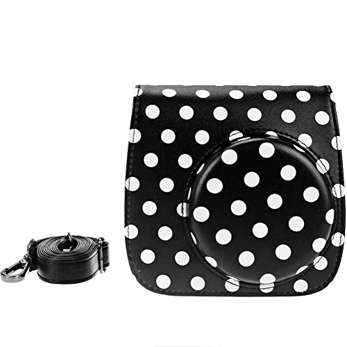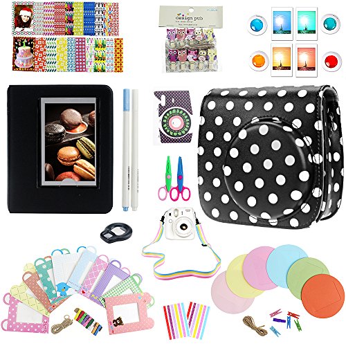 Elvam 12 in 1 Camera Accessory Bundles Set for Fujifilm Instax Mini 8 - Black Polka Dots (Mini 8 Case/Camera Strap/Album/Film Frames/Stickers/Border Stickers/Lens/Filter/Owl Clip/Pens/Scissors)