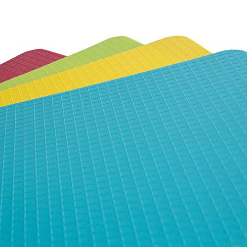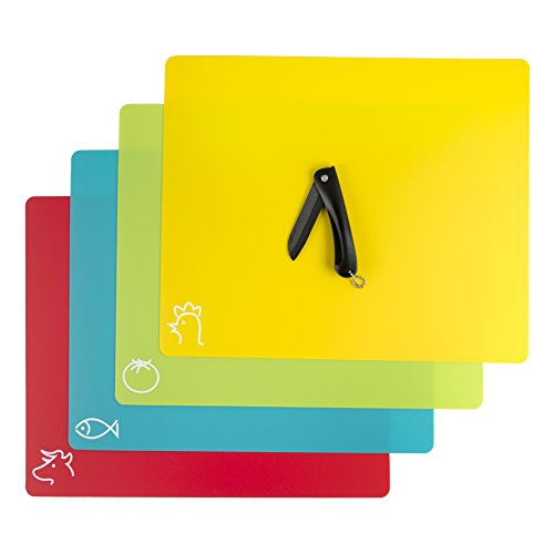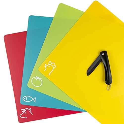Flexible Plastic Cutting & Chopping Board Mats, Non Slip Plastic Cutting Mats with Zirconia Ceramic Knife, Flexible Plastic Cutting Board Mats with Food Icons & Waffle Back (Set Of 4), Dishwasher Safe