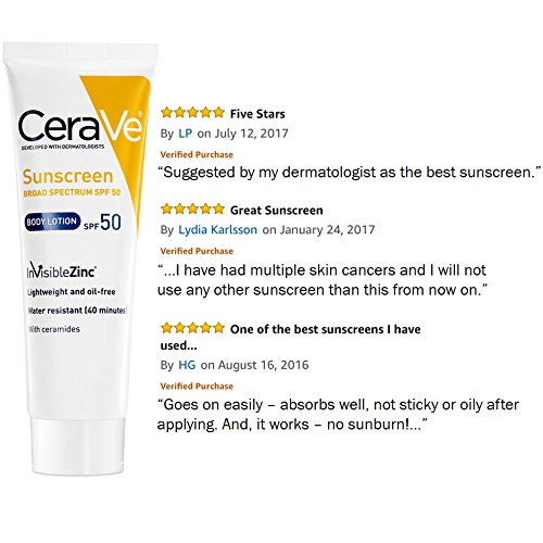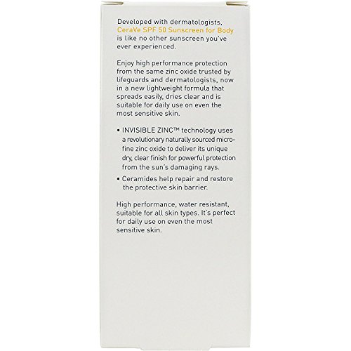 CeraVe SPF 50 Sunscreen Body Lotion provides broad spectrum, lightweight sun protection plus vital ceramides. Formulated with InVisibleZincTM Technology which delivers a unique dry with a clear finish. It is lightweight and oil free.
