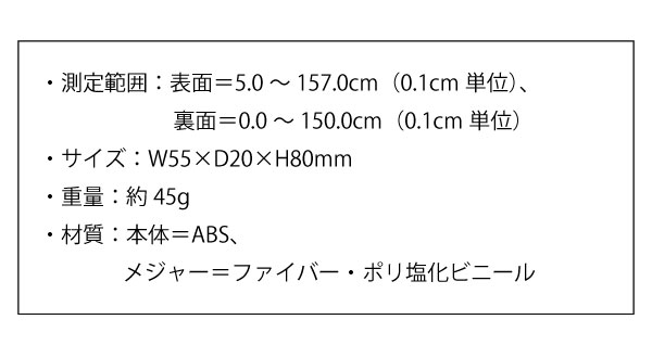 ●測定範囲:表面=5.0~157.0cm(0.1cm単位)、裏面=0.0~150.0cm(0.1cm単位)