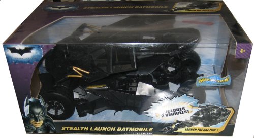 Product Description In The Dark Knight, Batman uses ultra-cool gear and vehicles to dismantle the remaining criminal organizations that trouble Gotham City. With the Stealth Launch Batomobile, one touch of a button reveals twin projectile missiles and becomes a launcher for hours of battle-play fun. Includes two vehicles and one 5-inch Batman figure. Batmobile measures 13.5" long. 0