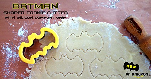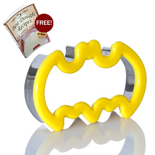- BATMAN COOKIE CUTTER WITH YELLOW SILICONE RUBBER FOR COMFORT GRIP: Metal Batman shaped cutter and a matching thick rubber combo, protects your hands, safe and comfortable, allows you and your kids to make as many Batman cookies as you wish. NEW - 5 recipes for the ultimate dough for cookie cut-outs - FREE with each order!