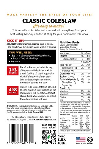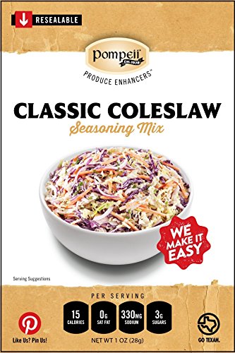 -. Binding : Misc. -. Brand : Pompeii Produce Enhancers -. EAN : 0075879840163 -. Feature : Quick & easy / Resealable-Make only what you need,save what you don't. / "kick it up" ideas for a variety of flavors. / Gluten free! -. IsAdultProduct : 0 -. Label : Sales USA Inc. -. Manufacturer : Sales USA Inc. -. ProductGroup : Grocery -. ProductTypeName : GROCERY -. Publisher : Sales USA Inc. -. Studio : Sales USA Inc. -. Title : Produce Enhancers Classic Coles Slaw 4 pack -. UPC : 075879840163