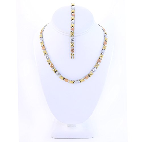 Hugs and Kisses Stainless Steel Stampato Necklace and Bracelet Set 3 Tone 18''