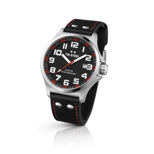 -. Title : TW Steel TW411 Pilot Black Leather Strap with Red Stitches - 48 mm