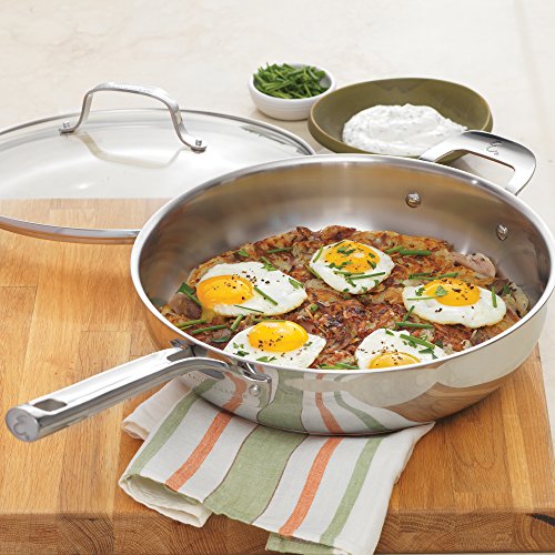 In my Emeril Lagasse stainless steel with copper core cookware you have the beauty of stainless steel with the added bonus of an aluminum base bottom surrounding a copper core. This means that the cooking surface heats up quickly and the heat is exceptionally well-distributed. These pots and pans are also ready to go from either conventional or induction stovetops straight to the oven and then for quick clean up, they are dishwasher-safe. Tempered glass lids make it easy to monitor cooking without lifting the lid and losing precious steam. Perhaps my favorite feature about this set, however, is the pour spouts and straining lids which work together to allow draining of cooking liquids without removing the lids. This generously sized, 5 quart covered deep sauté pan is perfect for braising, stewing, or cooking one-pot meals for a crowd.Feature