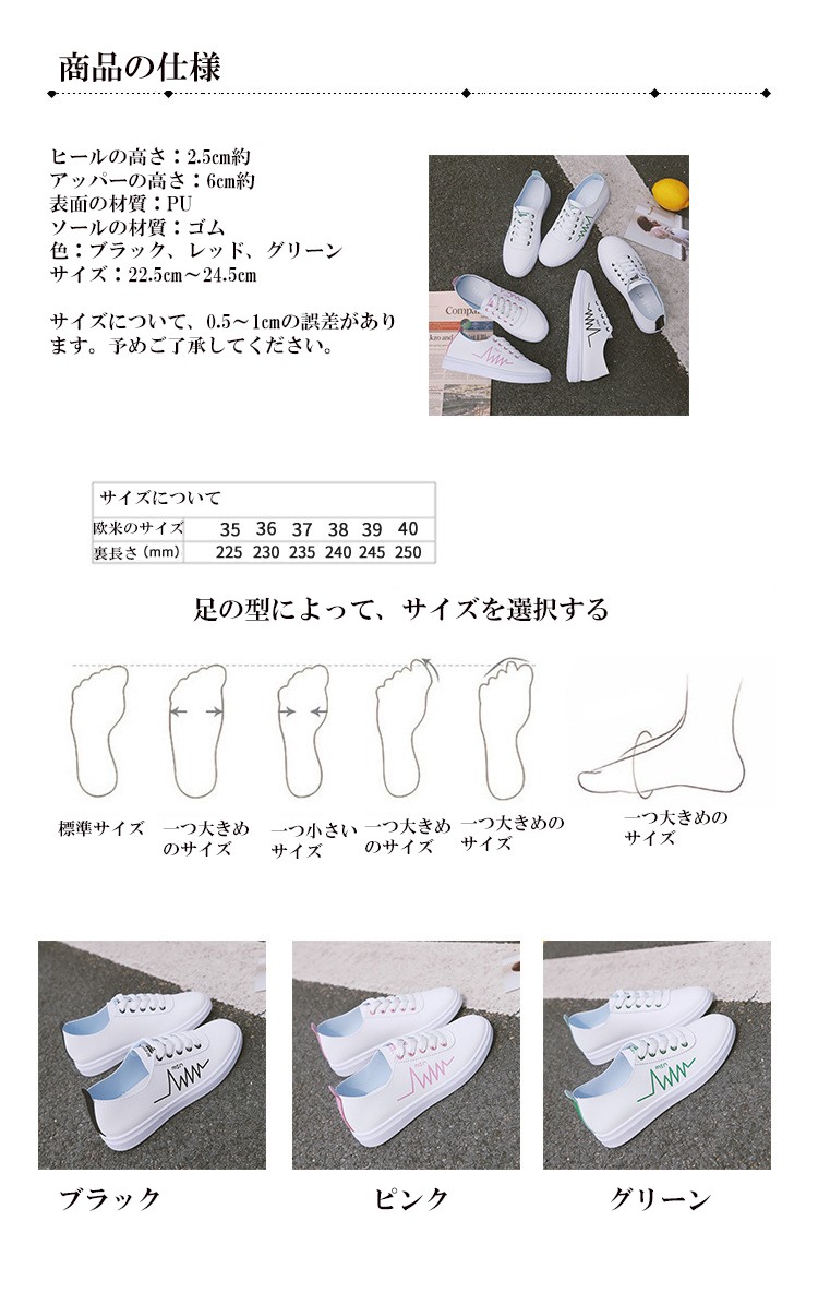 材質:PU+ゴム 色:ブラック、レッド ヒールの高さ:2.5cm約 アッパーの高さ:6cm約 サイズについてEU36=22.5cm EU36=23cm EU37=23.5cm EU38=24cm EU39=24.5cm EU40=25cm注意:※ サイズなど、商品詳細を必ずご確認後、ご了承頂いた上でご購入をお願いします。また、採寸方法違いにより、0.5~1cmの誤差がございますので、ご了承ください。商品内容:1xスニーカー特徴:【軽量、通気性よい】ゴムのソールとキャンパスの材質でスポーツシューズならではの軽さを実現し、通気性もよいです。どんな季節でも着用します。 軽量なので、ランニングや歩くや他の運動が易くになりました。【ファッションな配色】ファッションな配色で、シューズがファッションになり、女性に最適です。中学生などに通学靴としてもよい選択です。 【ゴムのソール耐滑】柔らかい材質で作って、ゴムのソールので、耐滑のです。スムーズな足運びをサポートします。球技や他の運動にもスムーズになりました。【利用場合】スポーツだけでなく、通勤や通学やアウトドア、普段履きとしても カジュアルなコーディネートをお楽しみい ただけます。