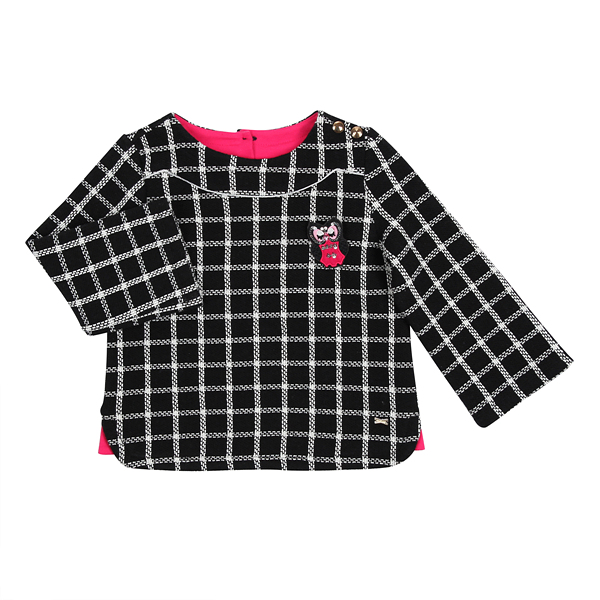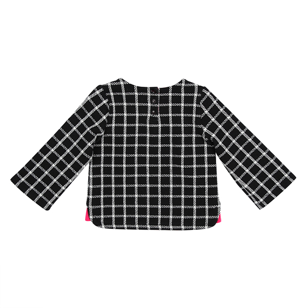상세설명-밑단에 핑크컬러가 살짝 보여지는 배색처리가 포인트가 되어 큐티한 이미지연출이 용이하며 팔기장이 8부기장정도의 티셔츠입니다.