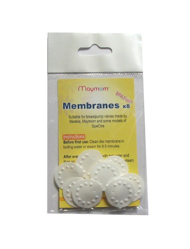 A retail package of 8 pc NEW membranes made by Maymom to be used with Medela's Pump-in-Style breastpump, Lactina, Symphony, Swing or other Medela pumps except FreeStyle. It does NOT contain BPA. It can be sterilized in water steam or boiling water.