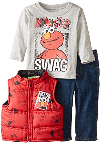 -. Binding : Apparel -. Brand : Sesame Street -. Color : Multi -. Department : baby-boys -. Feature : Screen-printed patch on vest / White flocking outline on monster swag wording -. Label : CAN Sesame St Baby -. Manufacturer : CAN Sesame St Baby -. PackageQuantity : 1 -. ProductGroup : Apparel -. ProductTypeName : SHIRT -. Publisher : CAN Sesame St Baby -. Studio : CAN Sesame St Baby -. Title : Sesame St Baby Boys' 3 Piece Elmo Long Sleeve T-Shirt Vest and Pant