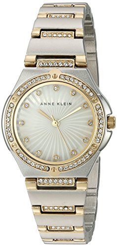 Anne Klein 2417MPTT women's watch features a 29mm wide and 8mm thick two tone yellow gold plated solid stainless steel case with 48 Swarovski crystals accented fixed bezel and textured push-pull crown. Anne Klein 2417MPTT is powered by an accurate quartz movement. This beautiful watch also features a textured white mother of pearl dial with gold tone luminous hands and 12 Swarovski crystals accented dot hour marker, scratch resistant reinforced mineral crystal and water resistant to 30 meters. Anne Klein 2417MPTT is equipped with a 16mm wide 41 Swarovski crystals accented two tone yellow gold plated solid stainless steel bracelet with a jewelry clasp. Anne Klein 2417MPTT women's Swarovski crystal bezel MOP dial two tone yellow gold steel watch is brand new and comes in an original Anne Klein gift box and is backed by a 2 year store limited warranty.Feature