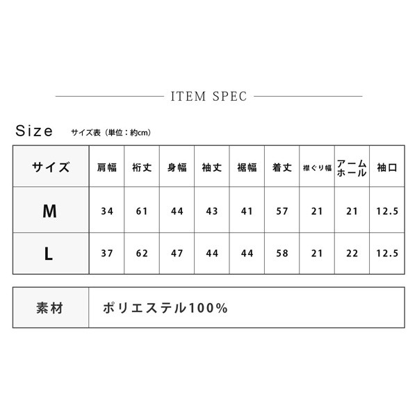 | サイズ | (M) 肩幅:34cm 裄丈:61cm 身幅:44cm 袖丈:43cm 裾幅:41cm 着丈:57cm 襟ぐり幅:21cm アームホール:21cm 袖口:12.5cm (L) 肩幅:37cm 裄丈:62cm 身幅:47cm 袖丈:44cm 裾幅:44cm 着丈:58cm 襟ぐり幅:21cm アームホール:22cm 袖口:12.5cm |