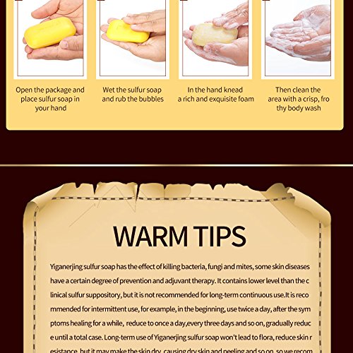 EFFECTIVE RELIEF FROM SKIN PROBLEMS - Potent Anti-Bacterial Action of yiganerjing soap, which can be attributed to its sulphur content and other anti-fungal ingredients, aids in fighting skin conditions like psoriasis, Acne, Eczema, Seborrhoea, Herpes, Skin Fungus., etc. Customers around the world are appreciating the way it has helped soothe their itching, irritation, flakiness, etc. while improving skin condition. Please note that we don't claim it to be a treatment for any problem.
