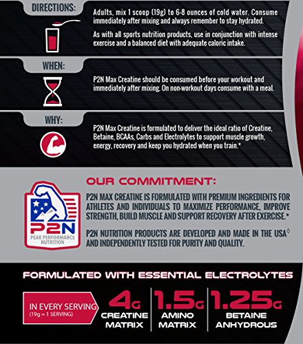 P2N Premium Creatine is formulated to deliver the ideal ratio of Creatine, Betaine and BCAAs to support muscle gain, energy and recovery when you train. P2N nutrition products are developed and made in the USA and independently tested for purity and quality.Feature