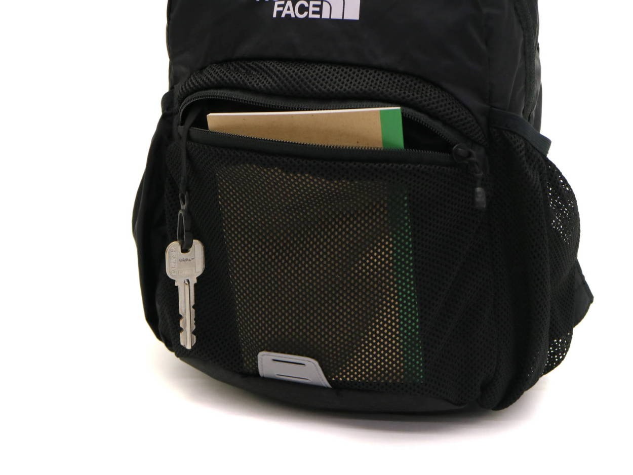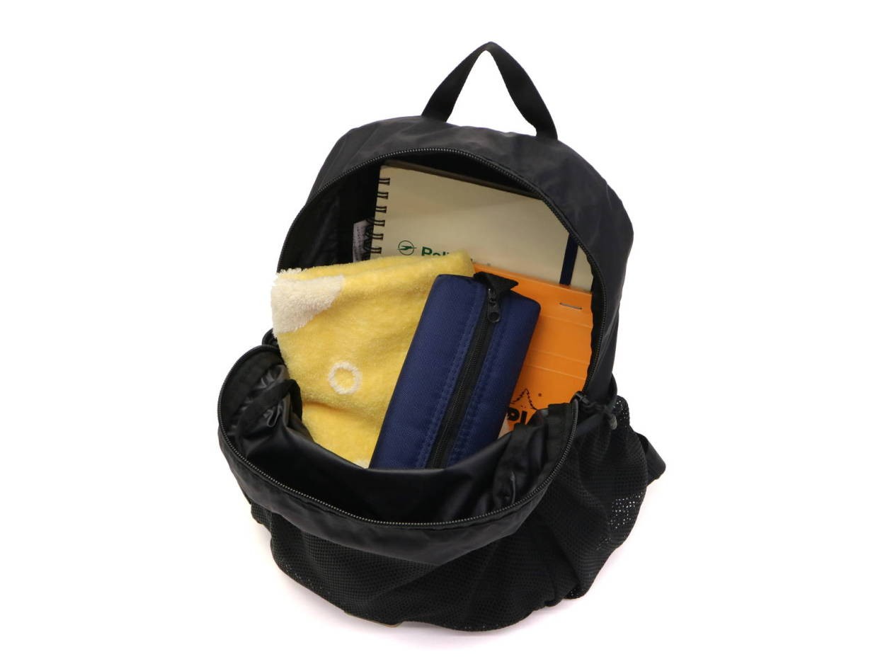外側には小分けポケットを複数装備。正面のポケットにはキーフックを設け、大切で小さなアイテムも失くさずに持たせることができます。また、メッシュ素材を使用することで、中身を確認できるのもポイントです。