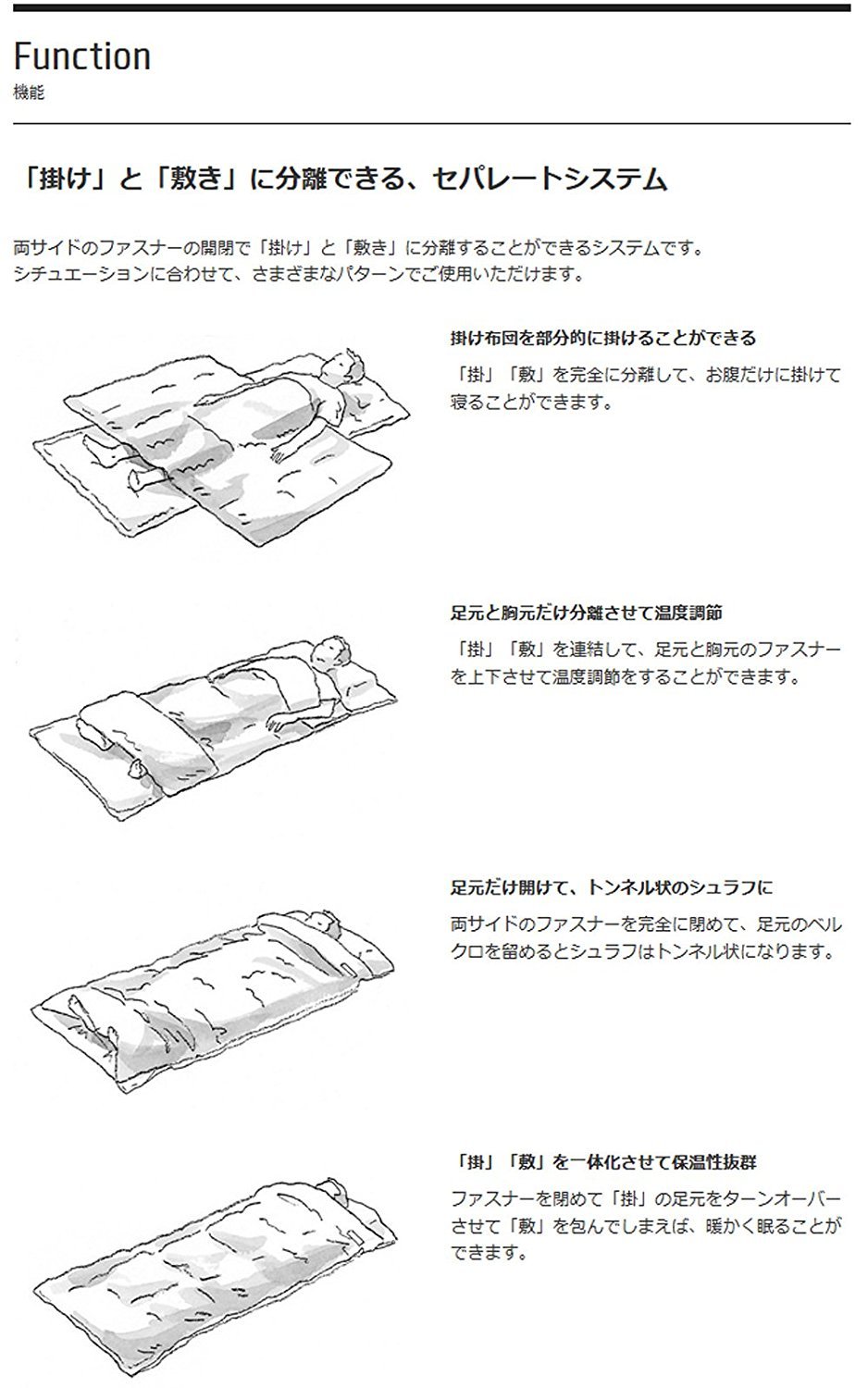 In a hot place it adopts a zipper for a turnover system that can open your feet in order to sleep in a cool place, and airtightness improves by closing fasteners in a cold place Down layer corresponding to colder (Optional · BDD 111