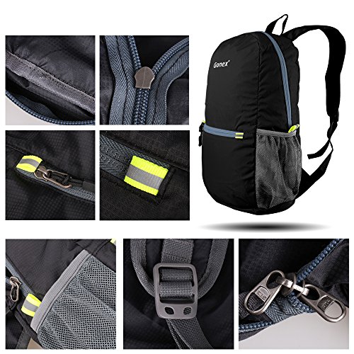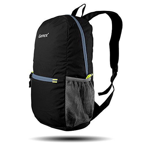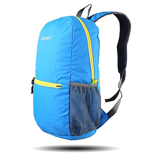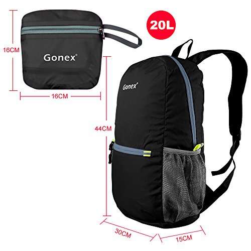 -. Brand : Gonex -. Feature : PERFECT COMPANION FOR TRIPS:This compact backpack is the perfect companion when you are out and about. It will be a fantastic necessity for not matter outdoor sports or leisure activities in or out of the city. Perfect for day trips, vacation, travel, day hikes, school, camping and shopping. / INCOMPARABLE QUALITY:Made from High Quality Water and Tear Resistant Nylon Material, durable Abrasion Resistant SBS Metal Zipper available. Reinforced more than 25 places with Bartack Process. / MORE STORAGE SPACE& KEEP THINGS ORGANIZED:Three zippered compartments. Main pocket is Large enough to carry what you need in the trip. Outer smaller pocket is great for quick access such as guide books and camera. Inner zippered pocket is a perfect place for valuables such as cash, credit cards and passport. / CONVENIENT AND LIGHTWEIGHT:It fits into an ultra-compact pouch. Easy to folds up into small pocket (Sandwich size). So you can easily pack it in your suitcase for use at their destination as an extra bag for the trip. / AIRPORT HERO: avoid overweight charges, simply unfold from your lage and use it as a carry on for your excess baggage. -. Label : GONEX -. Manufacturer : GONEX -. PackageQuantity : 1 -. ProductGroup : Sports -. ProductTypeName : OUTDOOR_RECREATION_PRODUCT -. Publisher : GONEX -. Studio : GONEX -. Title : Gonex Ultra Lightweight Packable Hiking Backpack Handy Daypack for Camping Outdoor Travel Cycling School 20 Liters 8 Color Choices