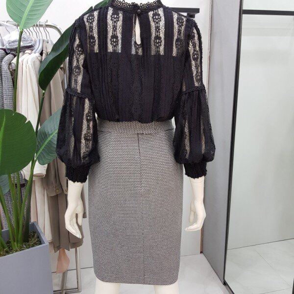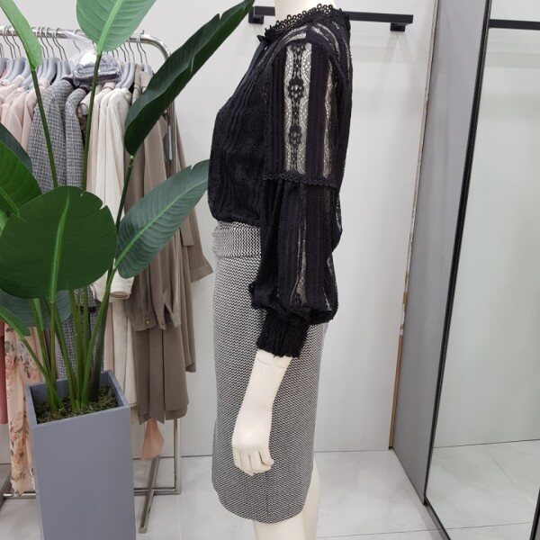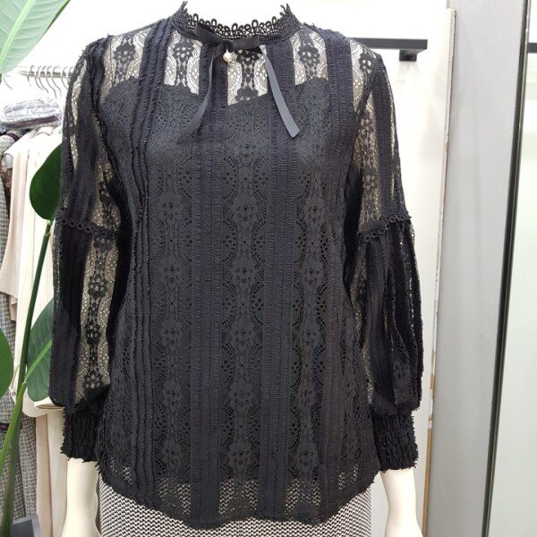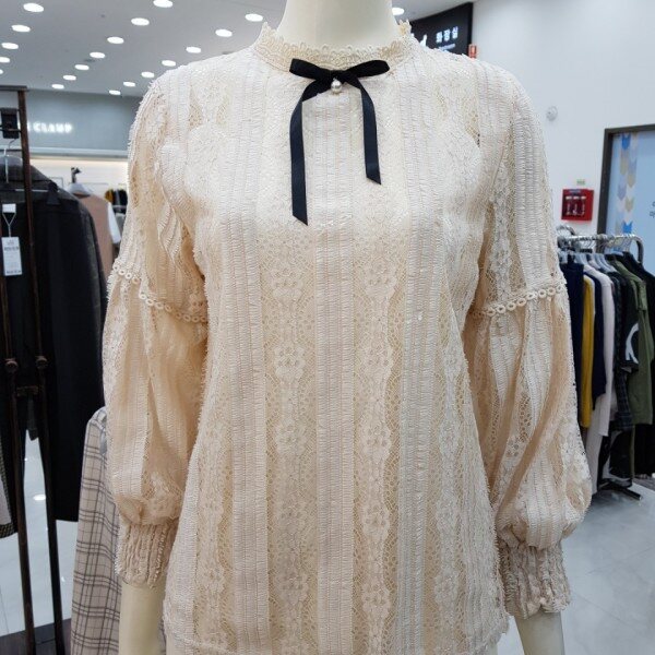 레이스 윈단에 퍼프 소매라인이 사랑스러운 블라우스입니다. 플라워패턴이 들어간 레이스가 고급스럽고 여성스러운 분위기를 연출합니다.