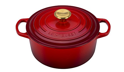 Since 1925, Le Creuset has been the leader in applying bold, rich, unique colors on cookware. The iconic Dutch oven is now available with a gold knob. This kitchen classic enhances the cooking process by evenly distributing heat and locking in the optimal amount of moisture. Oversized handles are easy to grip with potholders, and the interior enamel resists chipping and cleans easily.Feature