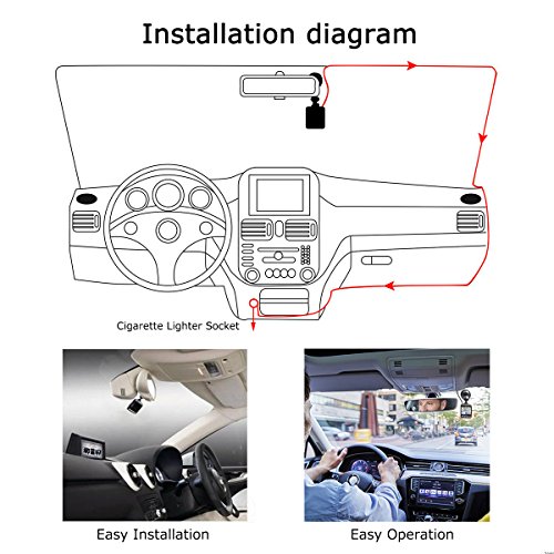 - 【Easy installation】 Easy to install and uploading footage, fixture of the cam to the windshield was simple sturdy enough. It fits perfectly behind the rear view mirror, so doesn't obstruct your vision. Comes with a super-long cigarette cable to plug into socket, which is easily routed out of sight.