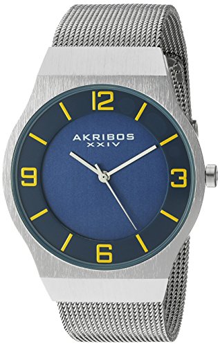-. Binding : Watch -. Brand : Akribos XXIV -. Color : Silver/Grey/Gun/Blue/Yellow -. Department : mens -. EAN : 0848572071369 -. Feature : Brushed blue center dial with raised border featuring three hand movement / P.R.Inted silver tone Arabic numerals and stick index with silver tone stick style hour and minute hands / Polished silver tone alloy case with fine mesh stainless steel bracelet / Quartz movement with analog display / Water-resistant to 30 M (100 feet) -. Label : TWI Watches, LLC -. Manufacturer : TWI Watches, LLC -. Model : AK851BU -. MPN : AK851BU -. PartNumber : AK851BU -. ProductGroup : Watch -. ProductTypeName : WATCH -. Publisher : TWI Watches, LLC -. Studio : TWI Watches, LLC -. Title : Akribos XXIV Men's AK851BU Round Blue Dial Three Hand Quartz Bracelet Watch -. UPC : 848572071369