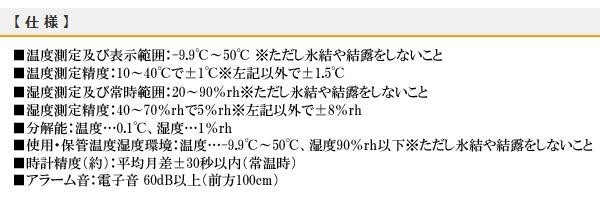 | 仕様 | ■温度測定及び表示範囲:-9.9度~50度 ■湿度測定及び常時範囲:20~90%rh (※ただし氷結や結露をしないこと) ■時計機能付き・アラーム機能付き ■前日/本日の最高・最低温湿度メモリー機能付き ■LEDバックライト付き ■使用電源:単4形乾電池×3本(別売) ■電池寿命:約1年(室温20度、湿度50%rhの場合にて、新品アルカリ乾電池使用時) |