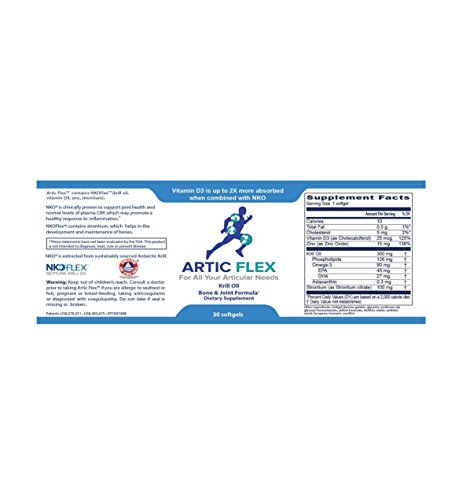 Studio : Artic Flex Publisher : Artic Flex Binding : Health and Beauty Product Description The ingredients used in Artic Flex aren't arbitrary; they are selected by orthopedic surgeons of the National Network of Orthopedic Surgeons (NNOS) based on clinical evidence demonstrating their improvements on bone and joint health.* Researchers have found that krill oil's phospholipid structure results in a higher bioavailability when compared to fish oil's triglyceride structure. This means that what's in the capsule is actually used by your body, not ignored and wasted (19,21). This same molecular structure of krill oil promotes the absorption of Vitamin D3, strontium, zinc and astaxanthin, too. These nutrients play vital roles in the body's bone and tissue regeneration and maintenance processes. 0