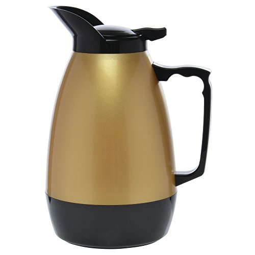 Studio : Hubert Publisher : Hubert Product Description This thermal coffee carafe is a great choice for restaurants, diners, cafes and convenience stores. The foam insulation maintains temperatures, making sure beverages remain steaming hot for the customer. This thermal coffee carafe has a durable plastic body with a protective coating to ensure long-lasting use. The insulated server features an attractive gold color with a metallic finish and black accents to complement any setting. This thermal coffee carafe has a push-button lid for safety. Hand washing is recommended for this item. 0