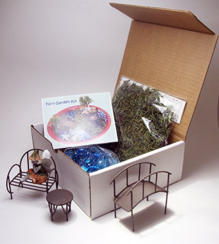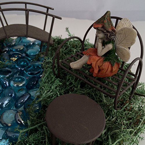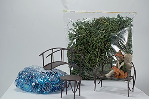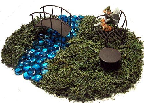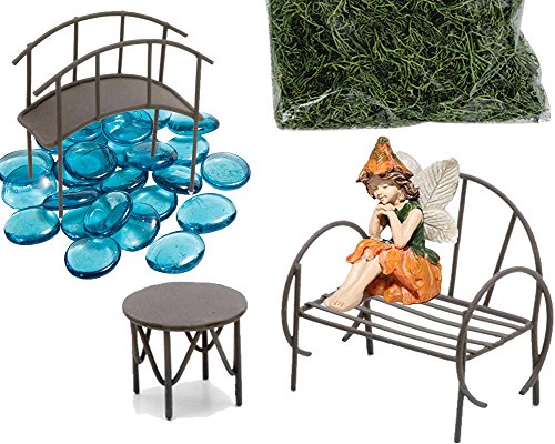 - ADD a Touch of Magic to your house or garden! Great fairy garden starter set or to add a new scene to accessorize a current collection. Bundle Includes: Bench, Table, Bridge, Fairy, Moss, Blue Glass Stones and Instructions.