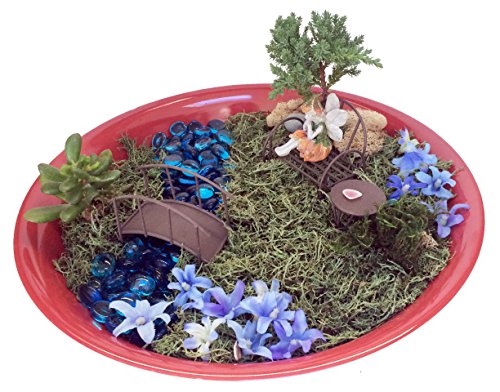 Fairy Garden Kit - Includes Fairy, Bench, Table, Bridge, Blue Glass Stones, Moss and Instructions