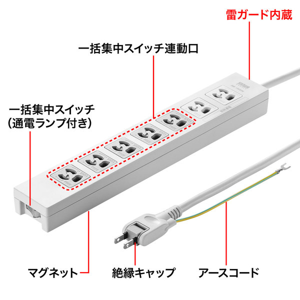 ●3P抜け止め7個口、集中スイッチ、マグネット、雷ガード付きRoHS対応タップ。ネームタグ、専用コンセントキャップ付属